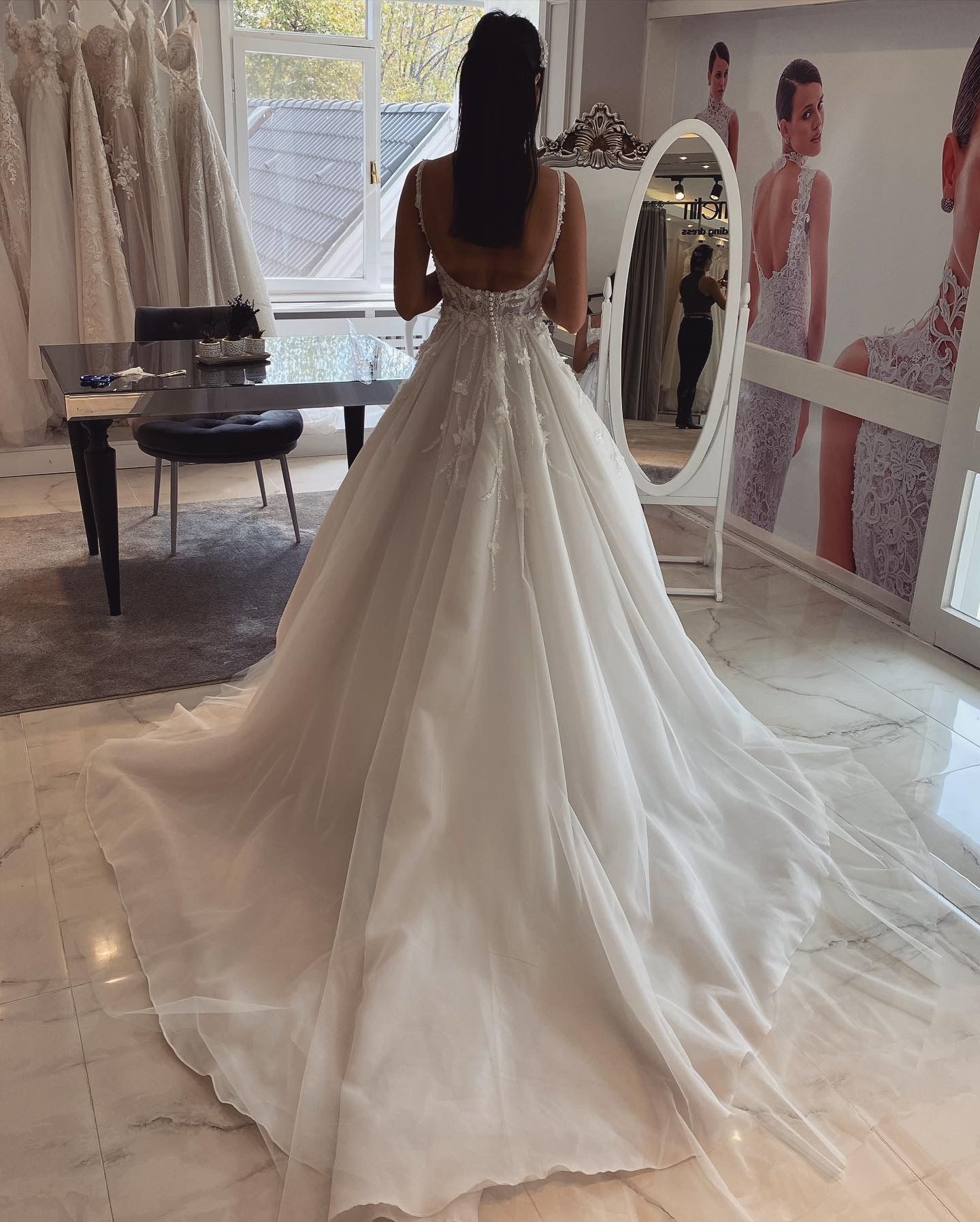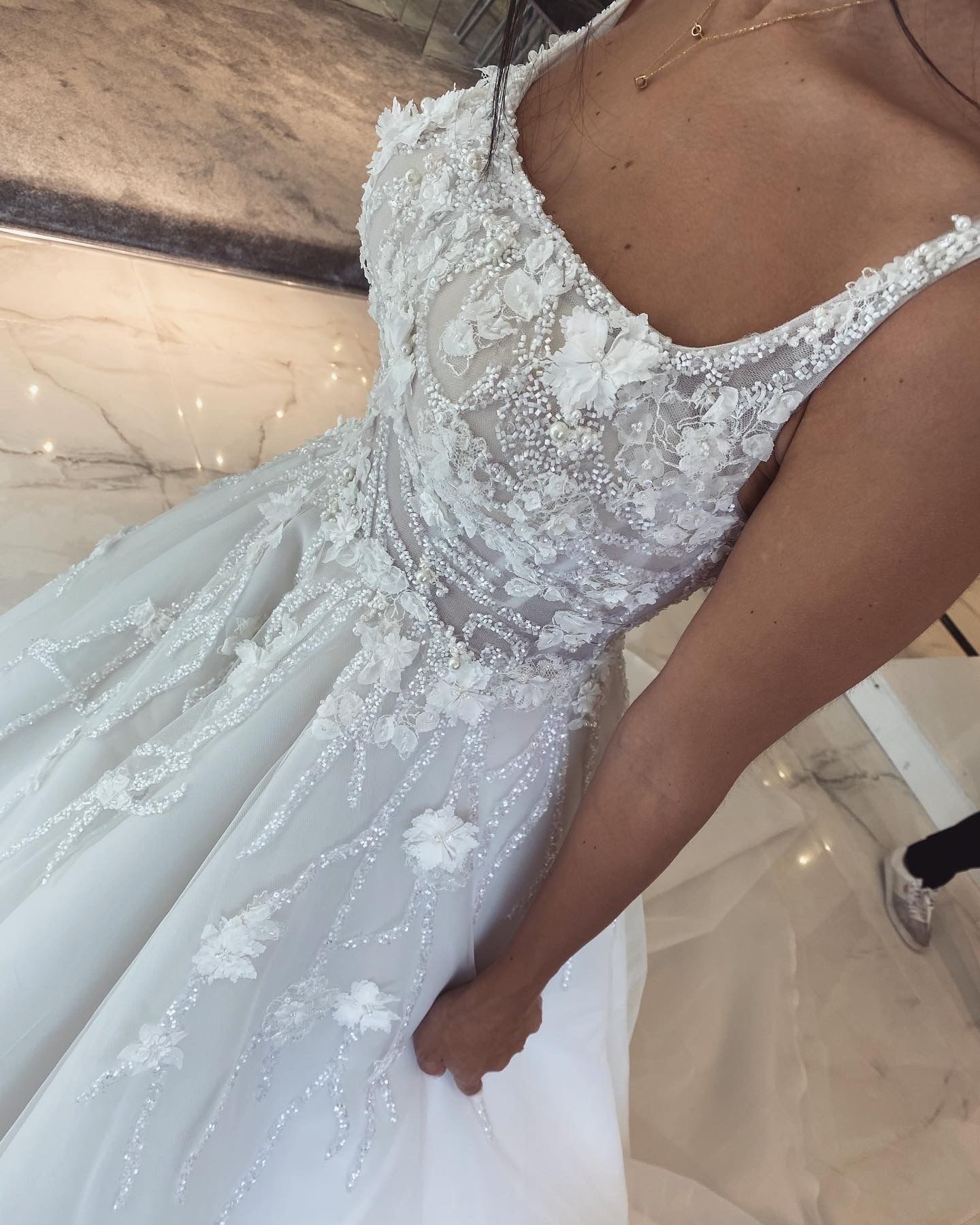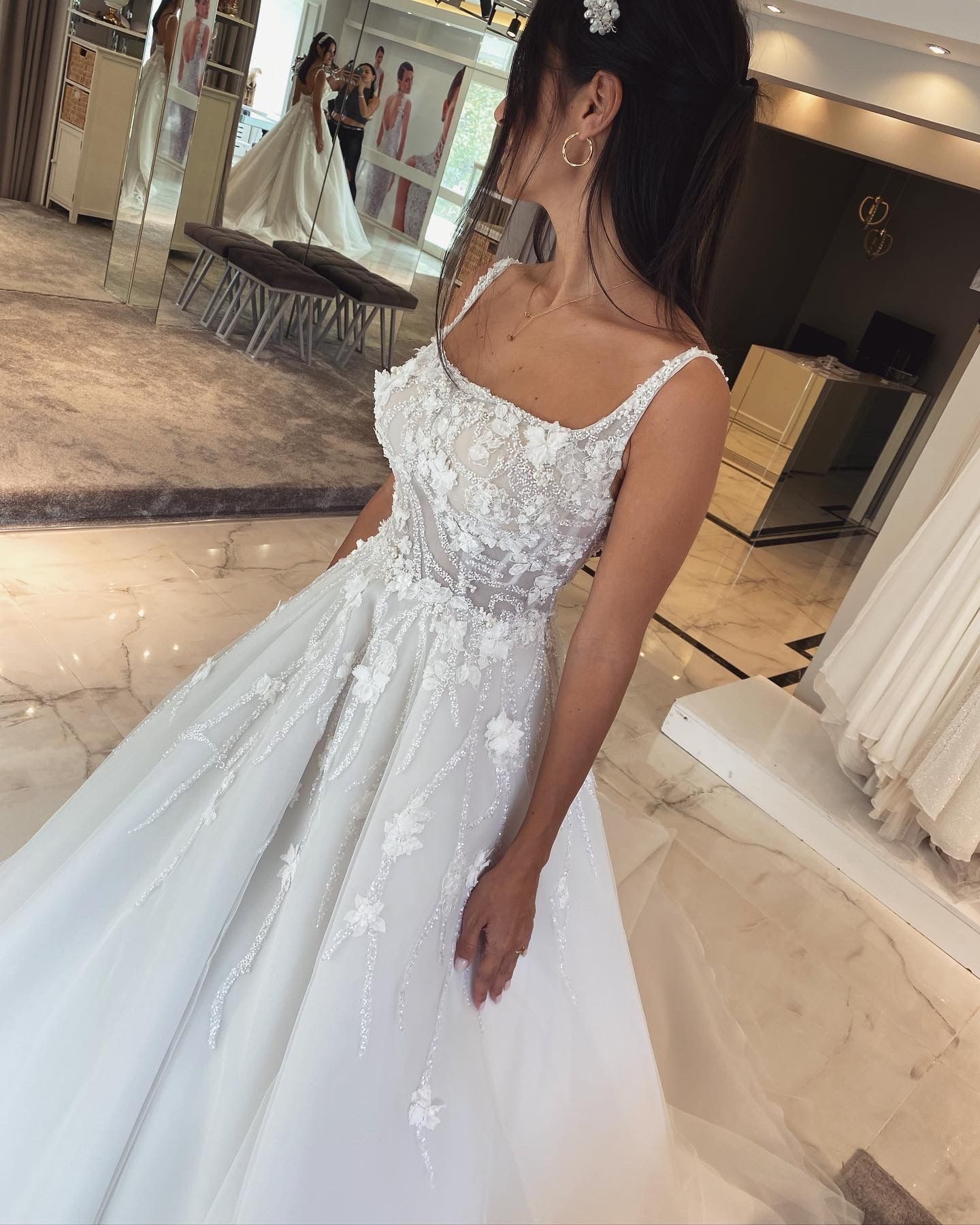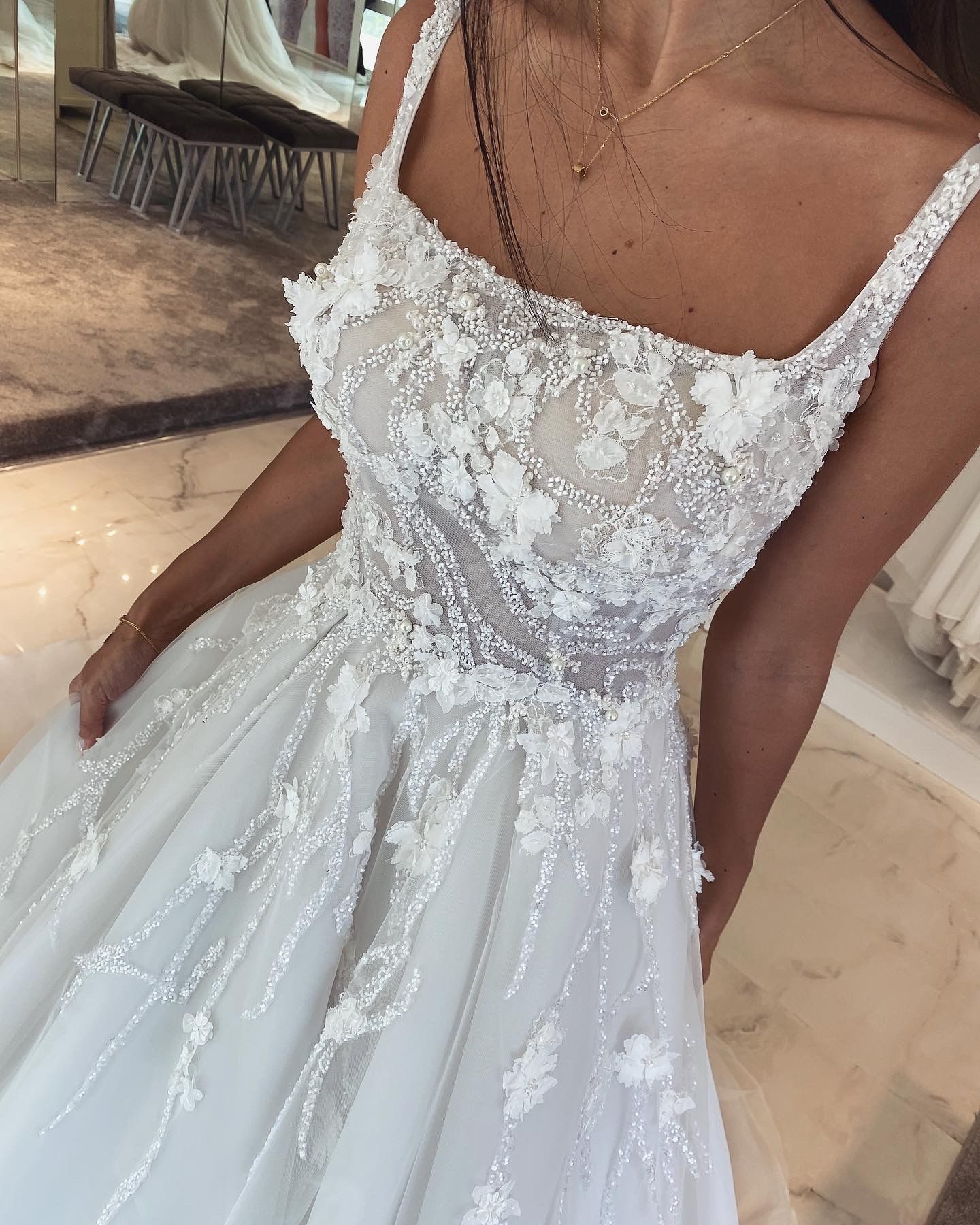 Crystal stones and small 3D flowers designed, U neck, A line weddingdress.