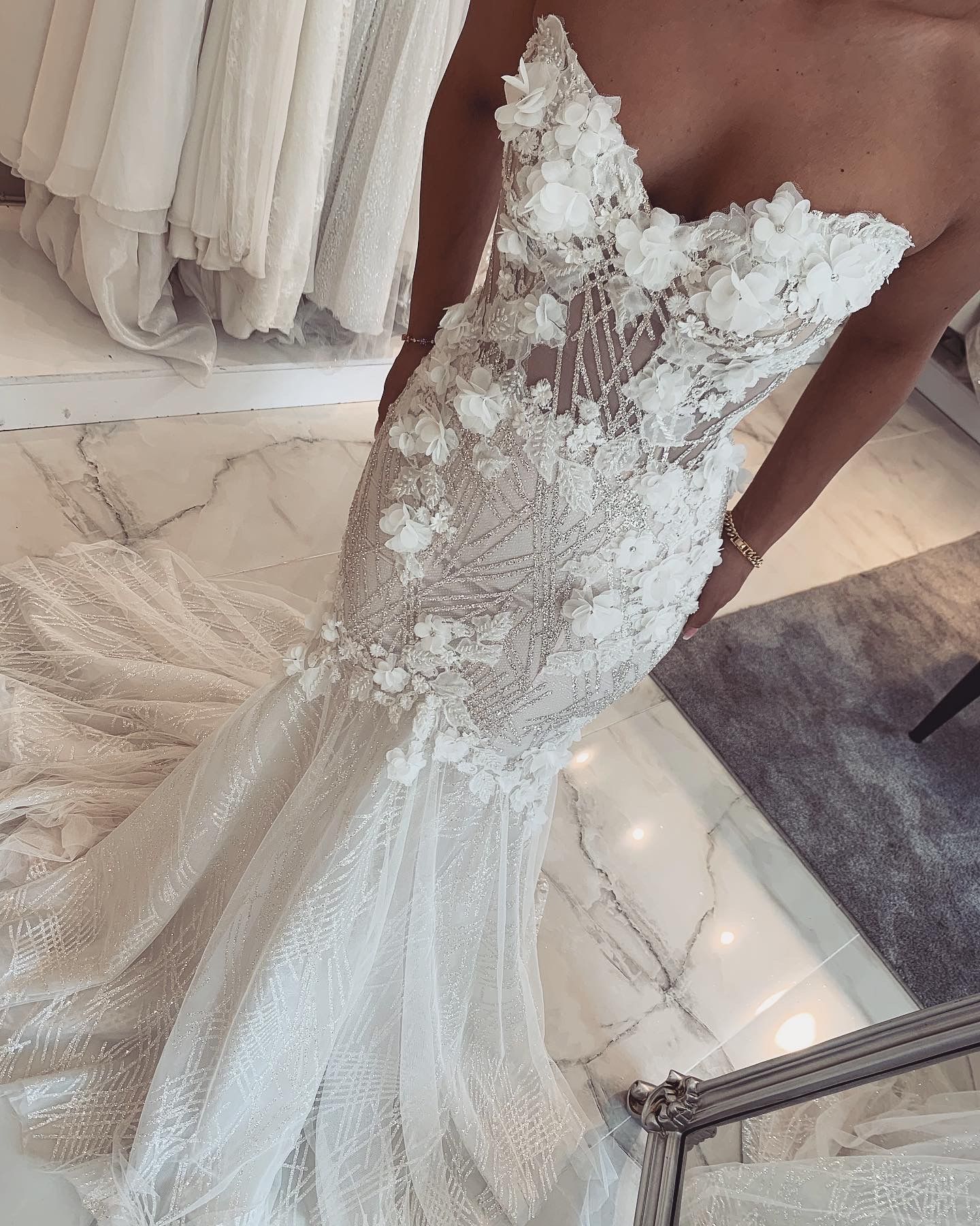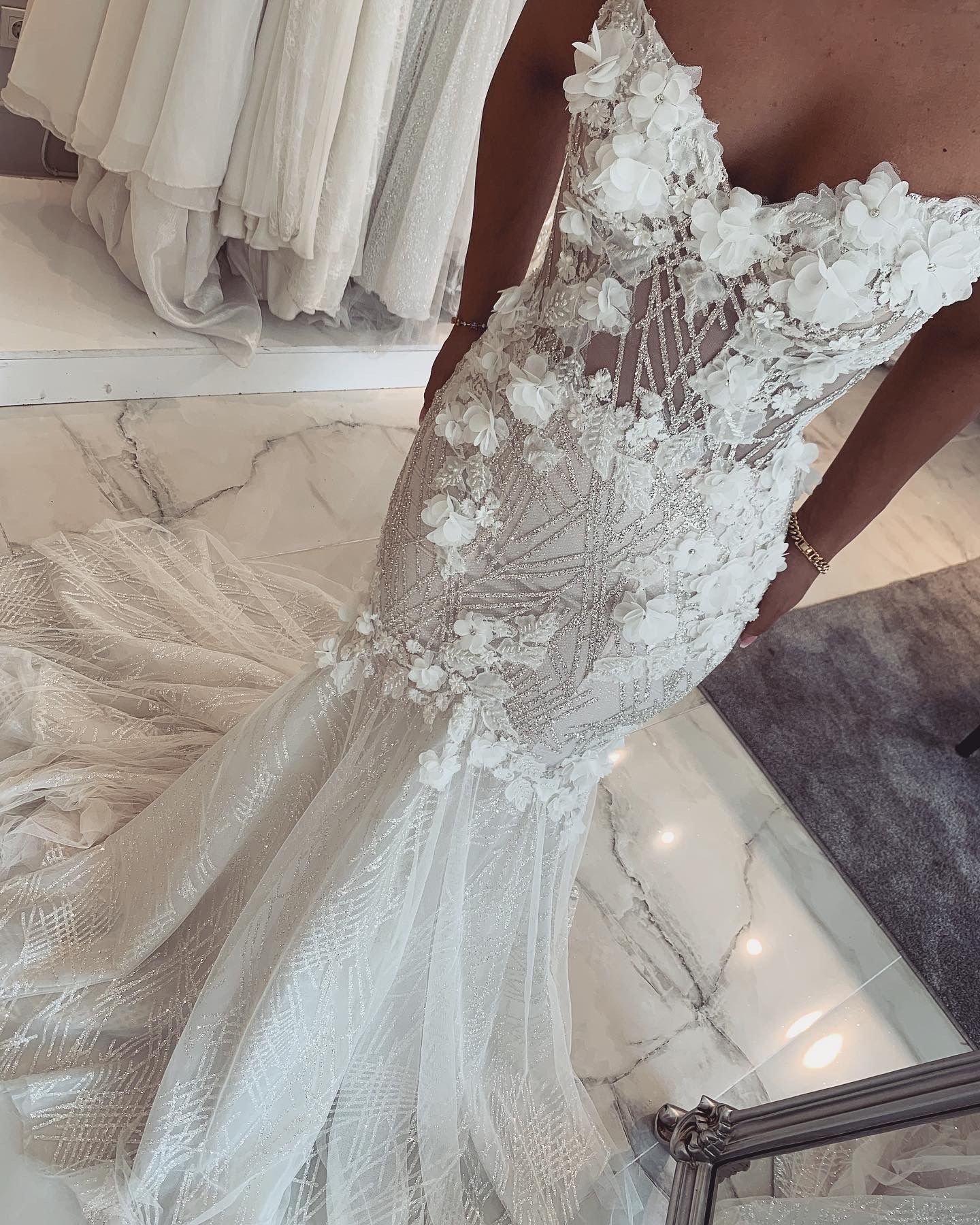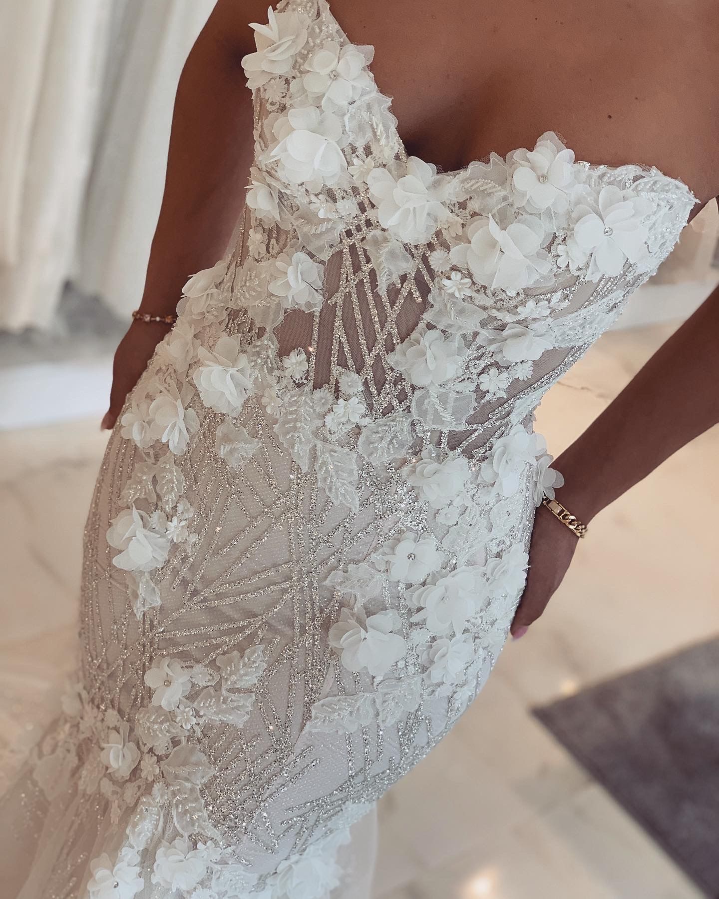 Geometric shiny tulle and 3D chiffon flowers designed. M neck and hang strap mermaid dress.