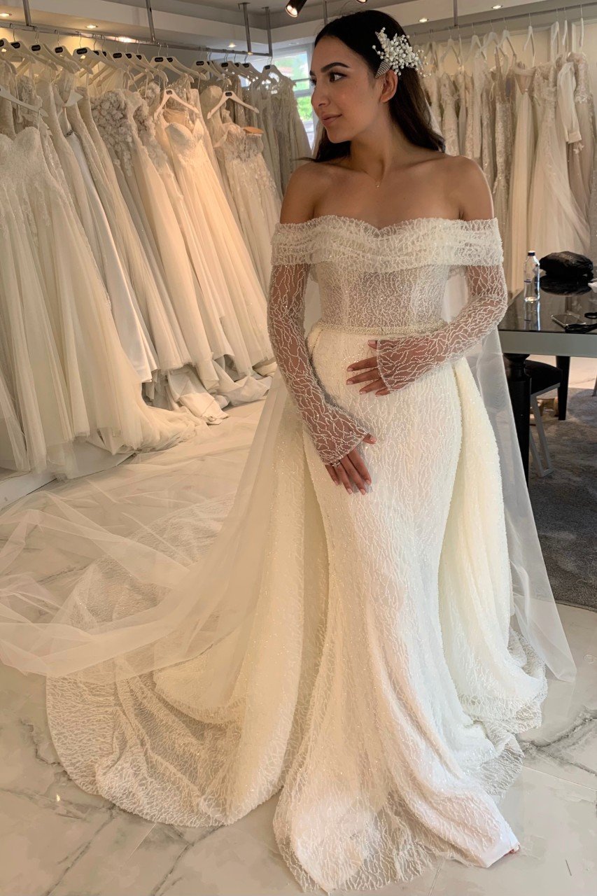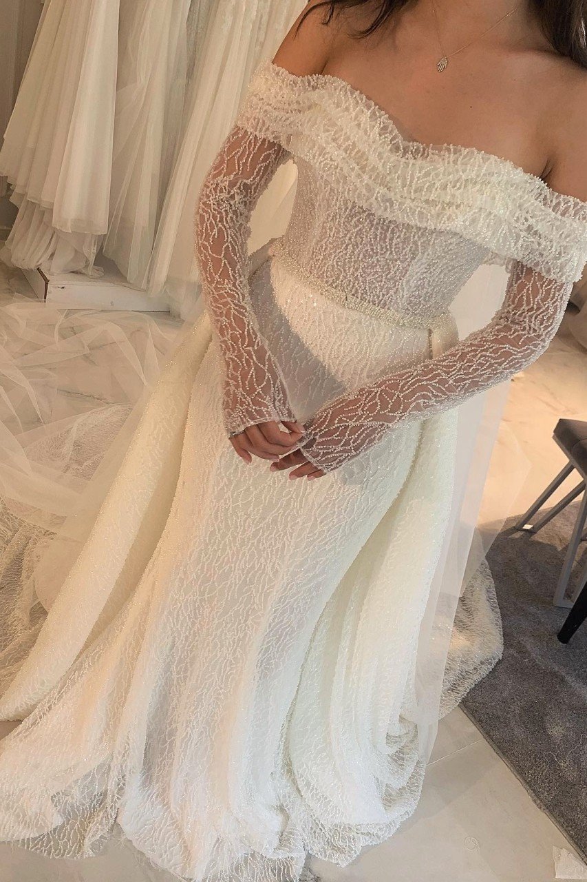 Boncuk işlemeli balık model üzerine, boncuk işlemeli takma kuyruk detaylı uzun kollu degaje yaka tasarım gelinlik.