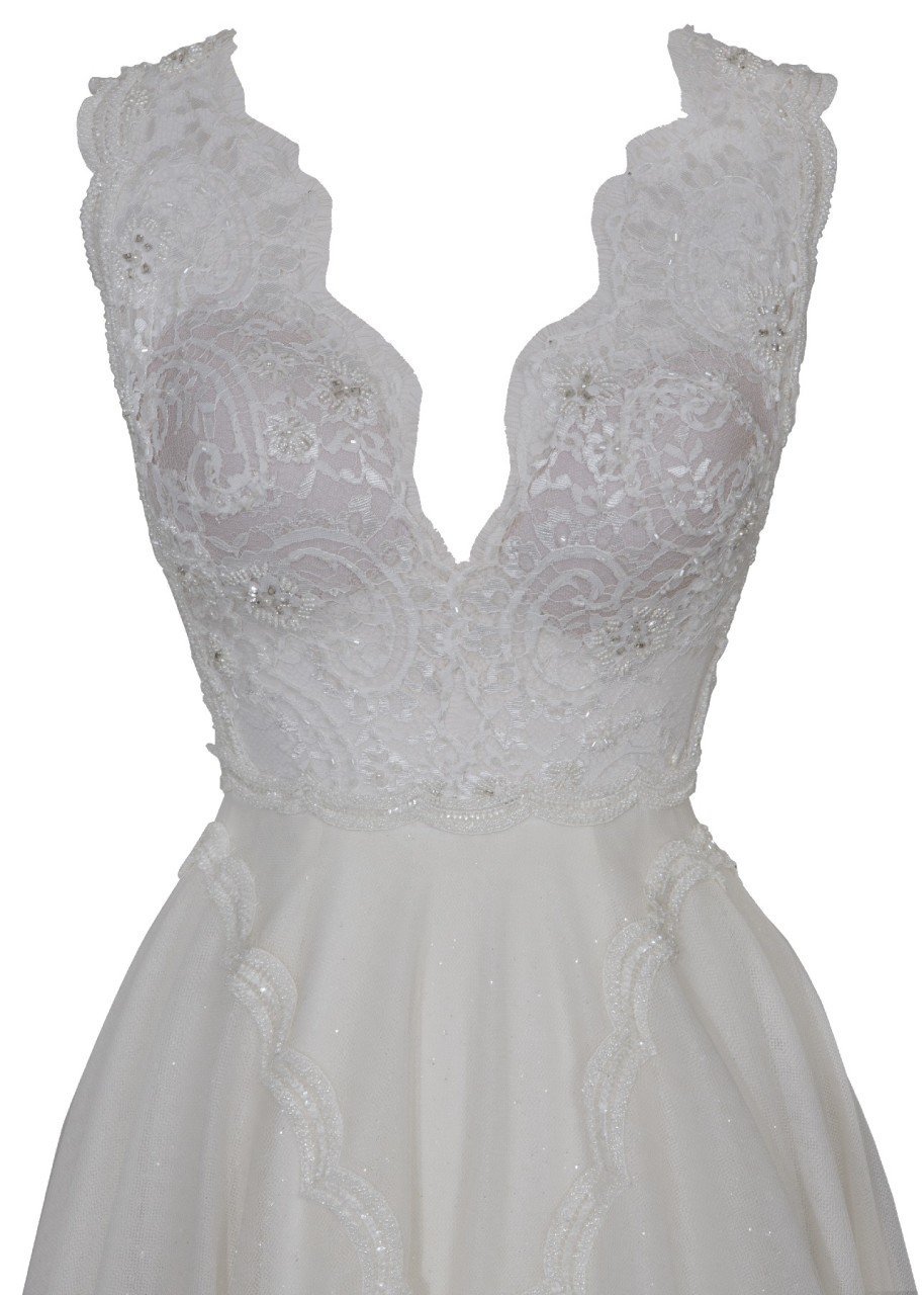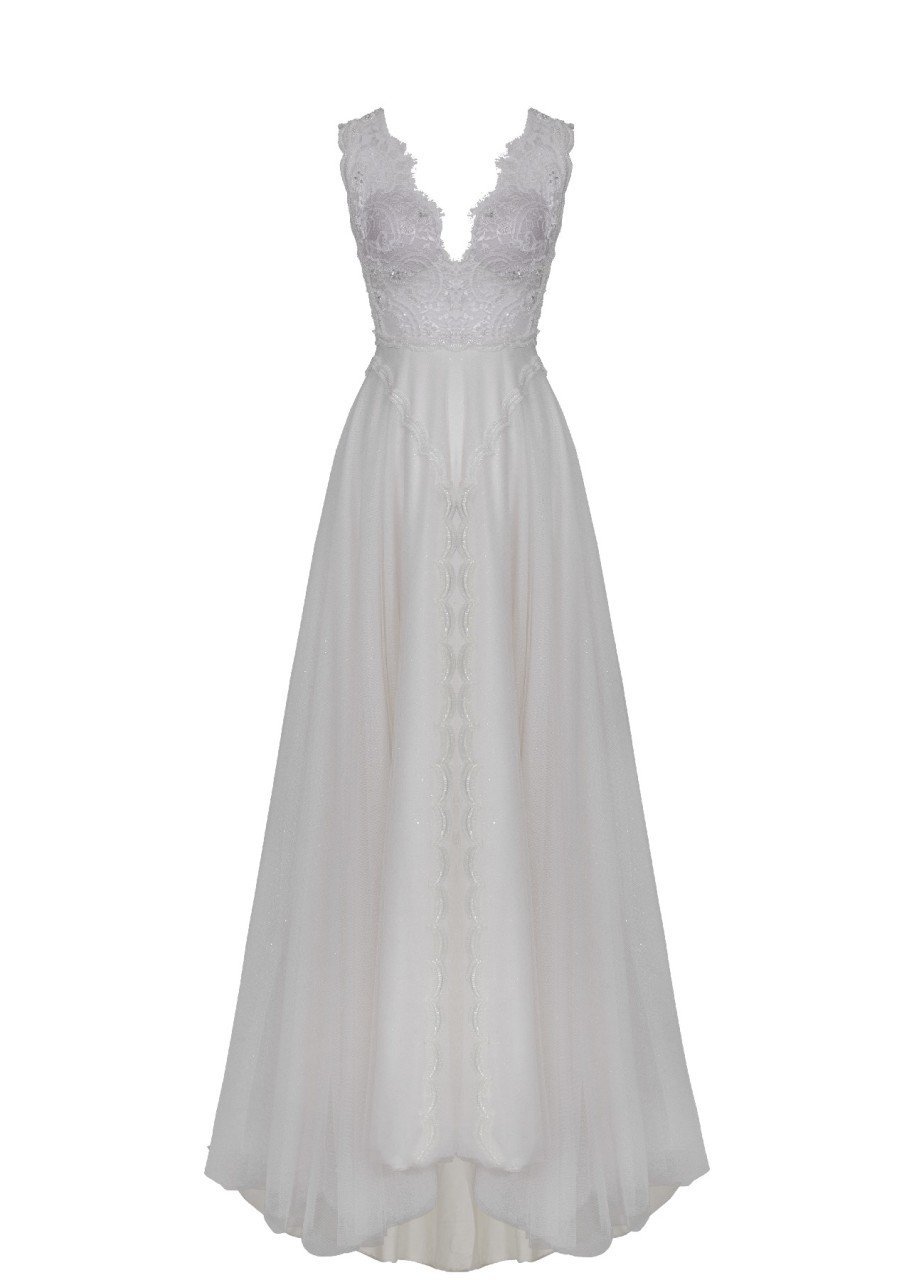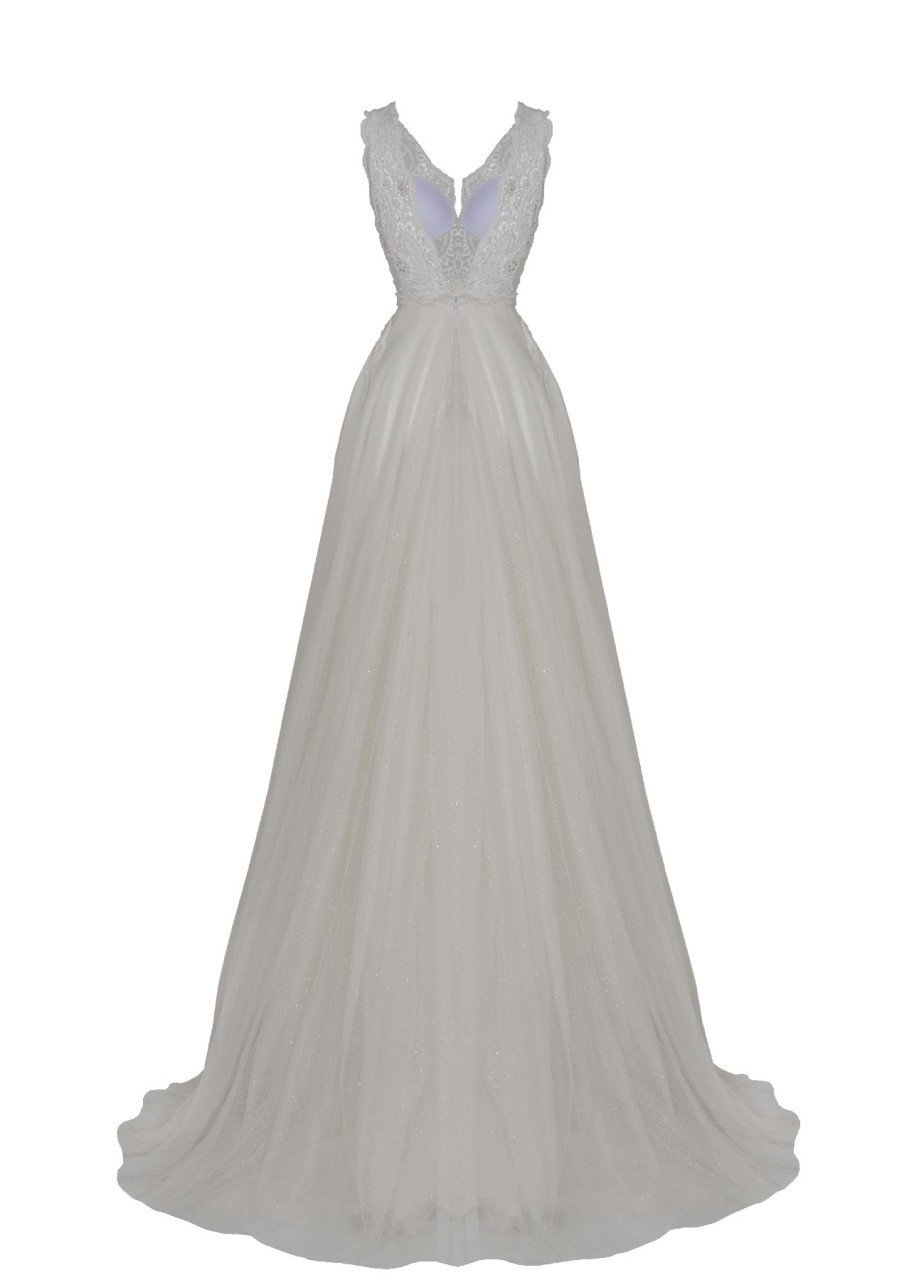 Yaka ve Sırt V Dantel Detaylı Yırtmaçlı A Kesim Gelinlik